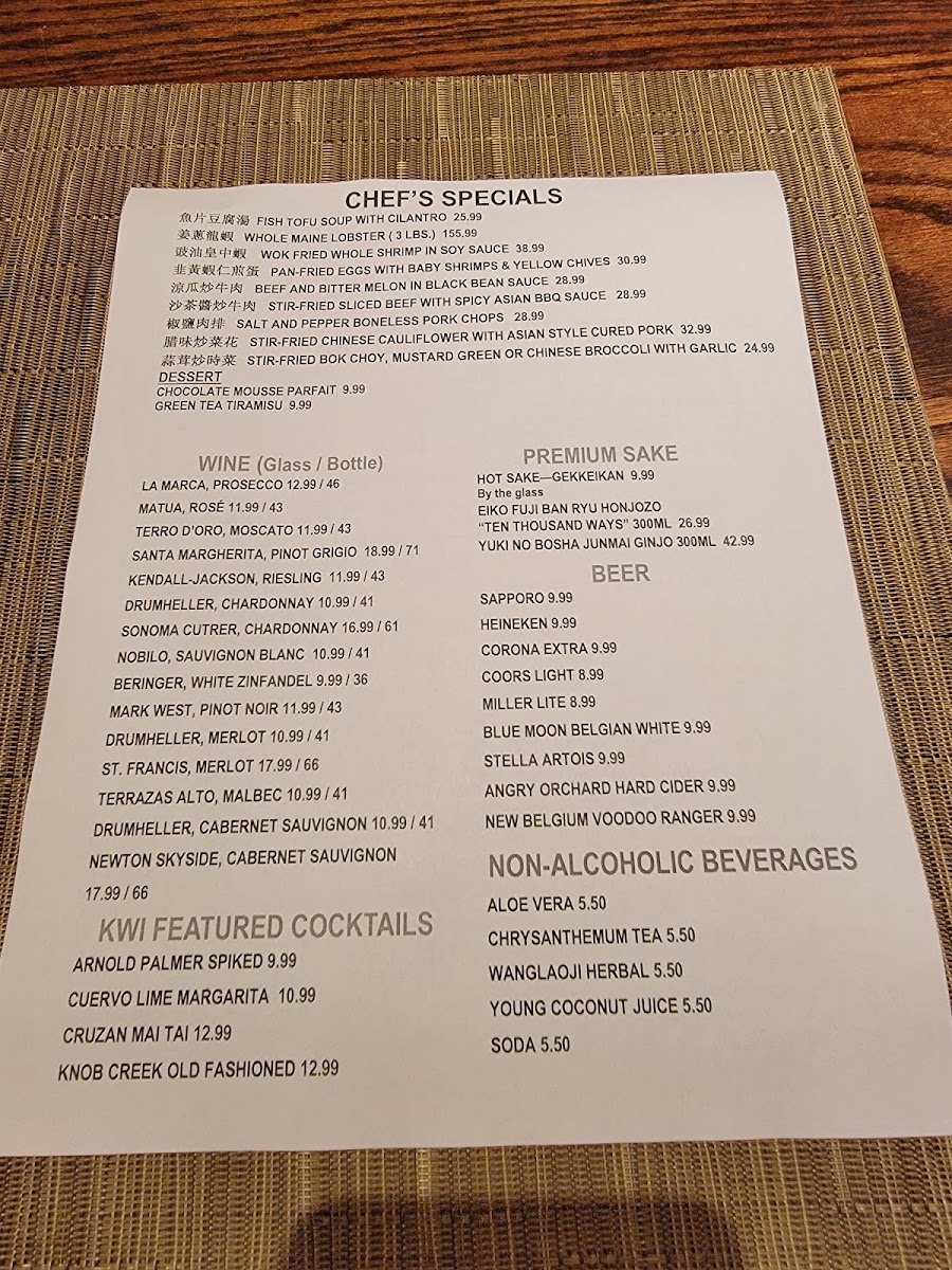 To complement your meal, Kwi Noodle House offers a tempting selection of drinks, including house-made cocktails like the refreshing Arnold Palmer Spiked and vibrant Cuervo Lime Margarita, as well as premium sake options that will elevate your dining experience.